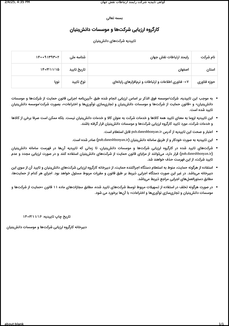 شرکت رایمند ارتباطات موفق به دریافت تأییدیه دانشبنیان شده است. این شرکت با تمرکز بر فناوریهای پیشرفته و نوآوری، در راستای توسعه اقتصاد دانشمحور و تجاریسازی نتایج تحقیق و توسعه فعالیت میکند. رایمند ارتباطات با بهرهگیری از دانش تخصصی، به ایجاد ارزش افزوده و رشد پایدار میپردازد.