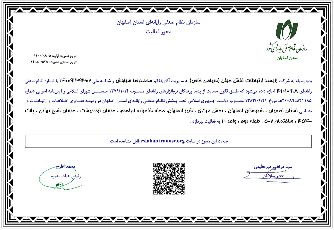 مجوز فعالیت سازمان نظام صنفی رایانه‌ای کشور، یک گواهی رسمی است که به شرکت‌ها و فعالان حوزه فناوری اطلاعات و ارتباطات (فاوا) در ایران اعطا می‌شود. این مجوز برای تایید صلاحیت حرفه‌ای و قانونی شرکت‌ها در ارائه خدمات مختلف فناوری اطلاعات، شامل نرم‌افزار، سخت‌افزار، مشاوره‌های IT، پشتیبانی فنی و توسعه سیستم‌های مختلف صادر می‌شود. دریافت این مجوز به شرکت‌ها اعتبار قانونی می‌دهد تا در بازار فعالیت کنند و به‌ویژه در پروژه‌های دولتی و بزرگ‌تر شرکت نمایند. این مجوز همچنین به‌عنوان یک ابزار برای تضمین کیفیت خدمات و استانداردهای حرفه‌ای در صنعت فاوا به شمار می‌آید.